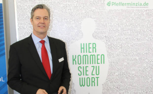 Hero Harder, zusammen mit Matthias Heß Geschäftsführer der Pfefferminzia Medien GmbH, am Stand.