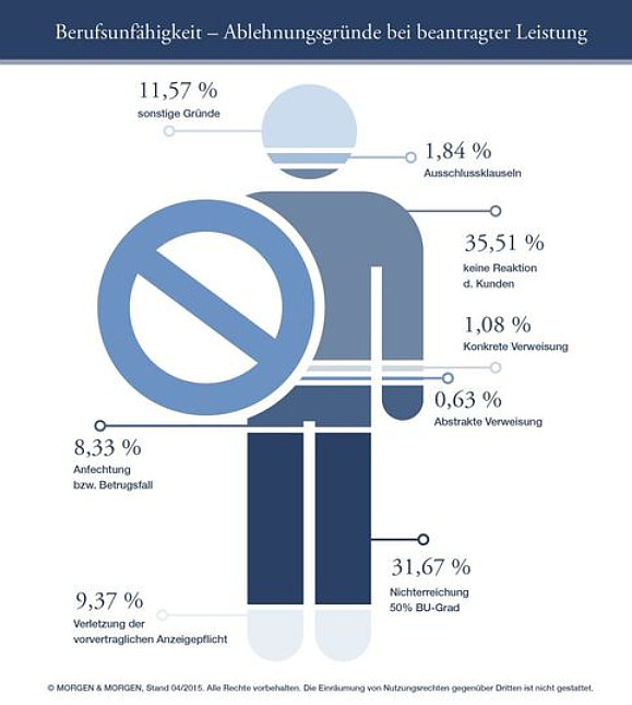 Wie die Daten von Morgen & Morgen laut eines Berichts des Versicherungsjournals zeigen, zahlen Versicherungen BU-Renten am häufigsten deshalb nicht, weil der Kunde im Ernstfall gar nicht reagiert oder den Antrag nicht mehr weiterverfolgt.