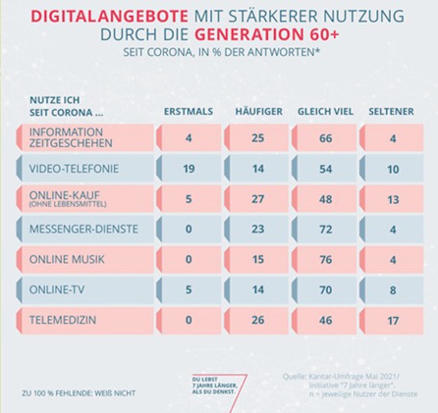 Jeder dritte Deutsche über 60 Jahren hat seit Beginn der Corona-Pandemie die Video-Telefonie erstmals oder häufiger genutzt als vorher. Auch andere digitale Angebote haben in der Gunst älterer Internet-Nutzer deutlich zugelegt, wie eine repräsentative Umfrage des Meinungsforschungsinstituts Kantar im Auftrag der Initiative „7 Jahre länger“ des Versicherungsverbands GDV ergab.