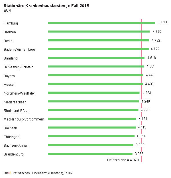 Die durchschnittlichen stationären Kosten je Fall waren in Brandenburg mit 3.953 Euro am niedrigsten und in Hamburg mit 5.013 Euro am höchsten. Diese regionalen Unterschiede sind auch strukturell bedingt: Sie werden vom Versorgungsangebot sowie von der Art und Schwere der behandelten Erkrankungen beeinflusst.