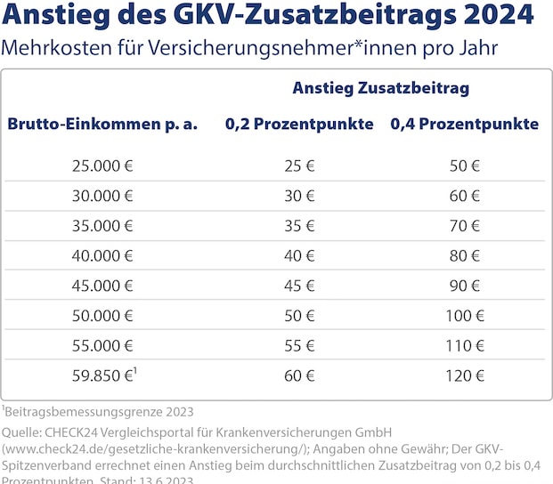 Was ein neuerliches Rekordniveau für die Haushaltskasse der gesetzlich Versicherten ab 1. Januar 2024 bedeuten würde, hat nun das Vergleichsportal Check24 einmal ausgerechnet: „Je nach Einkommen und Erhöhung des Zusatzbeitrags müssen gesetzlich Versicherte Mehrkosten von 25 bis 120 Euro pro Jahr tragen. Die gleiche Belastung kommt auch noch einmal auf Unternehmen zu“, sagt Daniel Güssow, GKV-Experte bei Check24 (siehe auch Grafik).