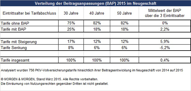 Das unabhängige Analysehaus Morgen & Morgen hat die Beitragsanpassungen für das Neugeschäft der privaten Krankenversicherungen für 2015 untersucht. Grundlage bildeten rund 750 PKV-Vollversicherungstarife, betrachtet für die Eintrittsalter von 30, 40 und 50 Jahren.