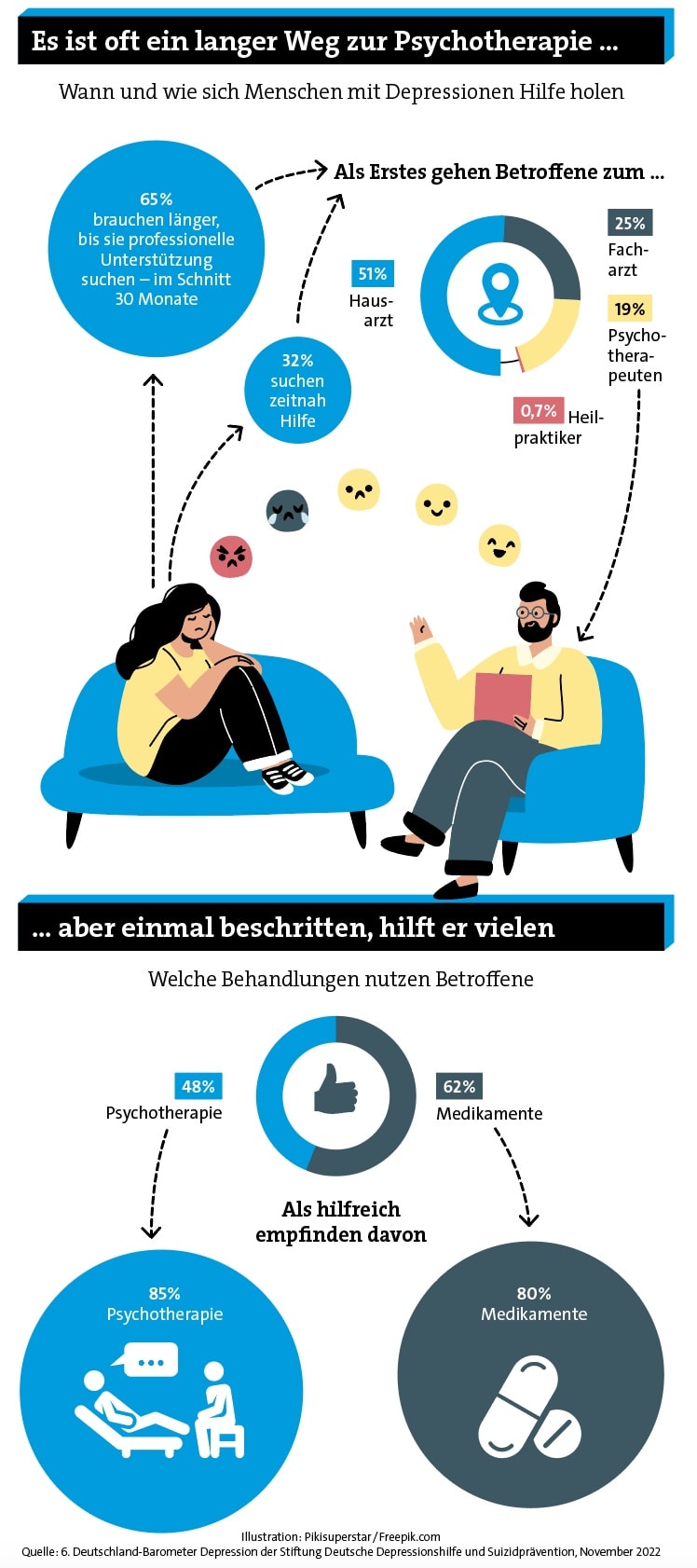 „Die Depression ist eine schwere, oft auch lebensbedrohliche Erkrankung. Dass ein großer Teil der Betroffenen Monate oder sogar Jahre braucht, um sich Hilfe zu suchen, ist besorgniserregend“, sagt Stiftungsleiter Ulrich Hegerl. Gründe hierfür seien Hoffnungslosigkeit und Antriebslosigkeit, die für eine Depression typisch sind, aber auch Versorgungsengpässe und die immer noch bestehende Stigmatisierung psychischer Erkrankungen, schildert Hegerl. Immerhin ein Drittel aller Betroffenen sucht sich sofort Hilfe. Bei der großen Mehrheit von 65 Prozent dauert es hingegen im Schnitt 30 Monate, bis sie professionelle Unterstützung in Anspruch nehmen (siehe Grafik unten).
