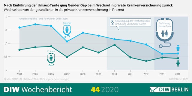 Bei genauer Betrachtung zeige sich, dass sich der Effekt der Unisex-Regelung nach Erwerbstätigengruppen unterscheide, heißt es weiter. Inzwischen wechselten selbstständige oder geringfügig beschäftigte Frauen sogar häufiger als Männer von der gesetzlichen in die private Krankenversicherung. Der Effekt bei Angestellten sei weitaus schwächer, so die Studienautoren.