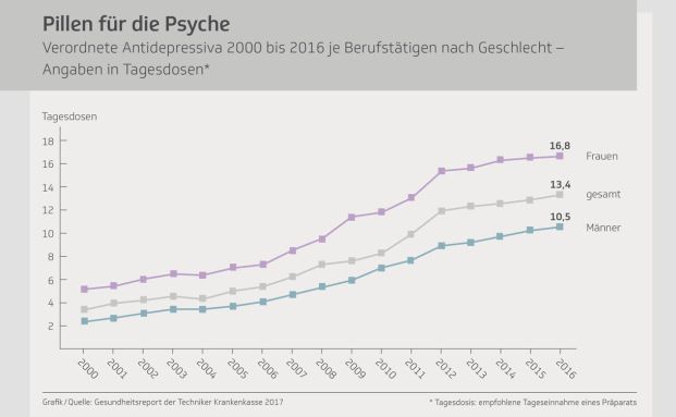 „Statistisch gesehen bekam jeder Beschäftigte im vergangenen Jahr für durchschnittlich zwei Wochen Antidepressiva verschrieben“, heißt es in der Stress-Studie der Techniker Krankenkasse (TK). Die verschriebene Menge habe sich damit seit 2007 mehr als verdoppelt.