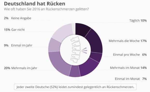 Wie eine aktuelle Umfrage von Statista zeigt, klagen 10 Prozent der Deutschen täglich über Rückenprobleme. 17 Prozent leiden mehrmals in der Woche an diesen Symptomen. Nur 15 Prozent der Deutschen haben gar keine Schmerzen im Rückenbereich.