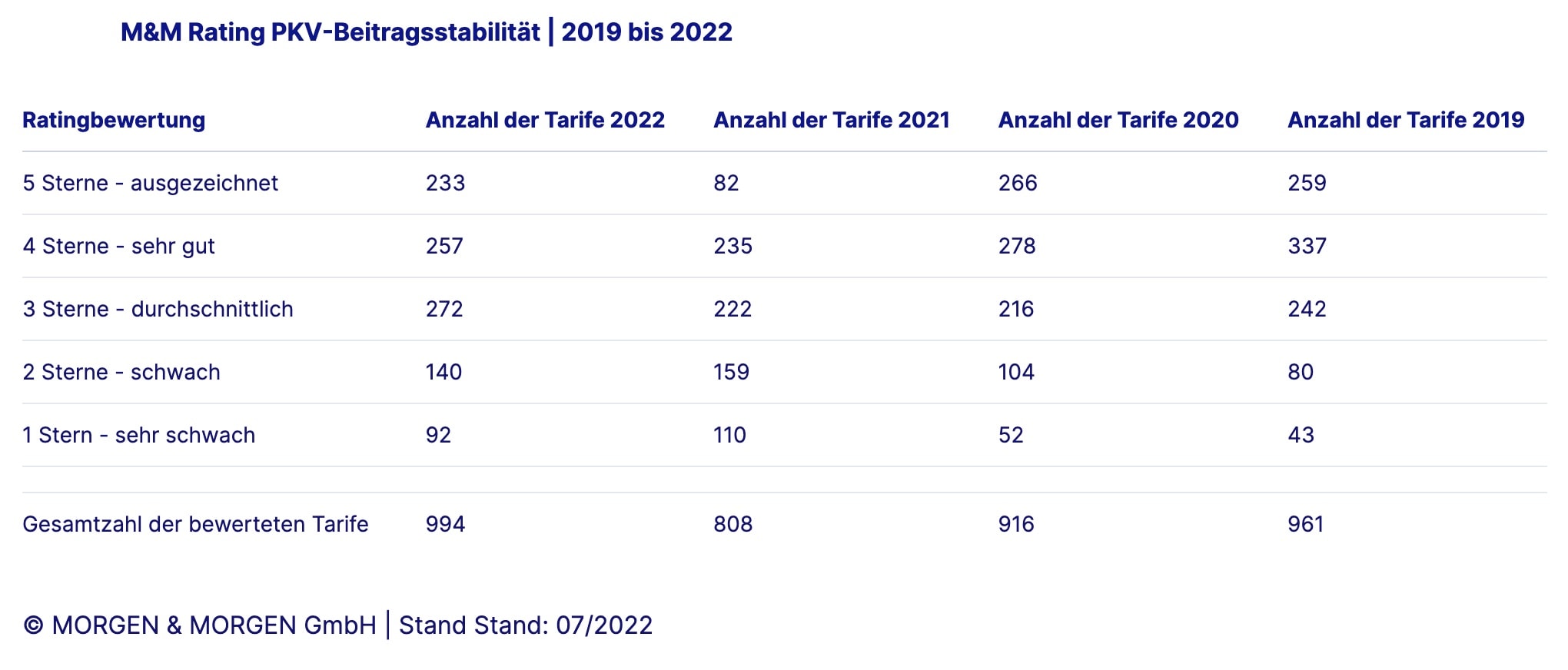 Aber nun ein Blick in die Details des „M&M Rating PKV-Beitragsstabilität“. Untersucht wurden Neugeschäftsbeiträge und Beitragsanpassungen der PKV-Tarife marktweit. Nur Tarife, die bereits seit mindestens fünf Jahren auf dem Markt sind, wurden im Rating berücksichtigt.
