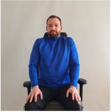 Die Hände liegen auf den Oberschenkeln, die Schultern sind entspannt