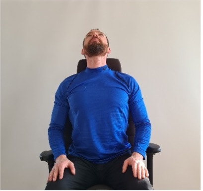 Übe anschließend Druck auf den Hinterkopf aus und ziehe das Kinn dadurch Richtung Brust