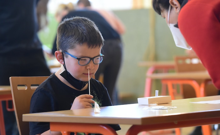 Ein Grundschüler führt unter Aufsicht einer Lehrerin einen Corona-Test durch: Laut dem Ifo Institut hat die psychische Belastung von Schülern durch Corona weiter zugenommen.