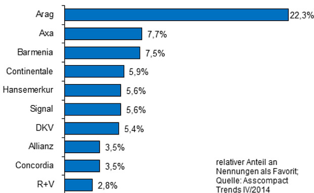 Die Axa gehört dabei zu den Aufsteigern, sie hat sich im Lauf des vergangenen Jahres von Platz 11 über Platz 8 und 4 auf den zweiten Rang vorgeschoben. Den größten Sprung machte indes die R+V Krankenversicherung mit einem Satz vom 17. auf den 10. Platz. Die Continentale kletterte vier Positionen nach oben.