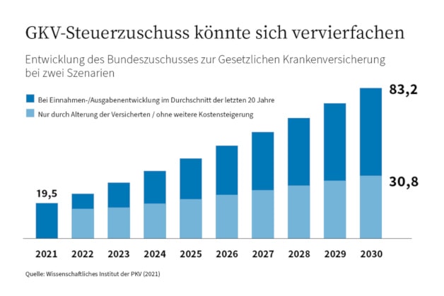 Um dieser Beitragssteigerung entgegenzuwirken, müsste sich der Bundeszuschuss bis 2030 mindestens auf 30 Milliarden Euro im Jahr verdoppeln, hat das WIP errechnet. Allerdings geht dieses Modell noch davon aus, dass die Einnahme- und Ausgabesituation der Kassen stabil bleibt – was angesichts der Entwicklungen in der Vergangenheit äußerst unwahrscheinlich sei. Stiegen Einnahmen und Ausgaben wie im Schnitt der vergangenen 20 Jahre, dann würden bereits 2030 rund 83 Milliarden Euro aus dem Bundeshaushalt gebraucht, um die Beiträge stabil zu halten.