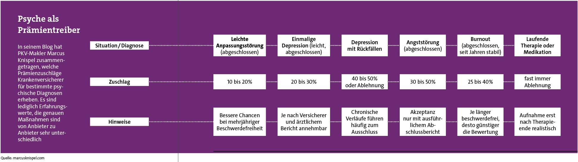 Lange Zeit bedeuteten solche Diagnosen – ob korrekt oder nicht – das Aus, wenn sich jemand privat krankenversichern wollte. Krankheiten im Kopf stellten für die Versicherer ein enorm hohes Risiko dar, das sie sich lieber nicht ans Bein binden. Warum das so ist, beschreibt PKV-Makler Sven Hennig in seinem Blog: „Behandlungen sind langwierig, oft über Jahre, so sind wöchentliche Sitzungen über zwei Jahre durchaus mit Kosten jenseits der zehntausend Euro anzusetzen.“ Zudem können psychische Beschwerden schnell körperliche Beschwerden auslösen, zum Beispiel Rückenschmerzen.