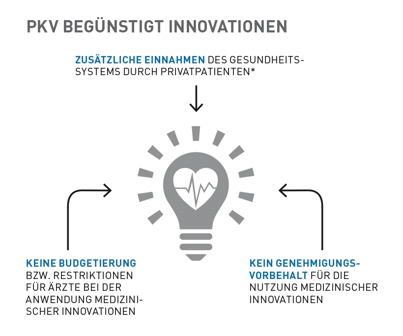 Im Gegensatz zur Gesetzlichen Krankenversicherung gibt es in der PKV geringere Genehmigungsvorbehalte bei Innovationen und niedrige Budgetgrenzen für die Ärzte. Und auch die Mehreinnahmen durch Privatpatienten können genutzt werden, um in medizinische Innovationen für alle zu investieren. Die Infografik gibt einen Überblick.