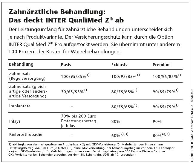 Eine solide Grundabsicherung bietet der QualiMed Basis. Diese Variante enthält etwa eine 100-prozentige Kostenübernahme für 50 Psychotherapie-Sitzungen bei einem Arzt oder zugelassenen Psychotherapeuten pro Jahr. Bei Unfällen ist eine Unterbringung im Ein- oder Zweibettzimmer vorgesehen. Bei Zahnersatz übernimmt die Inter hier 70 Prozent der Kosten.