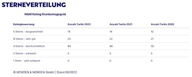 Die 91 Tarife sind im M&M Rating Krankentagegeld hinsichtlich ihrer Leistungen sowie auf die Verbraucherfreundlichkeit ihrer Versicherungsbedingungen bewertet worden. Die von Morgen & Morgen angesetzten Mindestkriterien legen besonderen Wert darauf, dass der Versicherer auch bei Wiedereingliederungsmaßnahmen und Teilarbeitsunfähigkeit leistet.