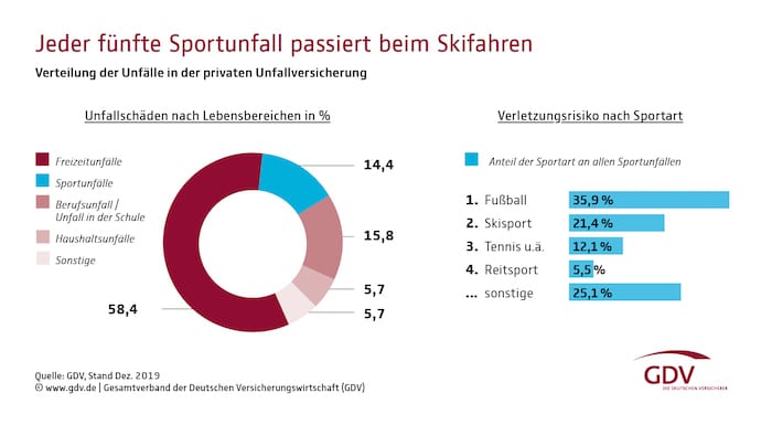 Der Branchenverband GDV geht davon aus, dass täglich rund 100 Skiunfälle passieren. Pro Saison verletzen sich sogar 44.000 bis 46.000 deutsche Skifahrer so stark, dass sie ärztliche Hilfe brauchen. Damit ereignet sich jeder fünfte Sportunfall auf der Piste (siehe Grafik).
