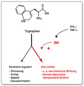 Sind im Körper seit längerer Zeit stille Entzündungen vorhanden, so werden dadurch bestimmte Enzyme aktiviert, wie beispielsweise die Indolamin-2,3-Dioxygenase, kurz IDO genannt. Liegt eine erhöhte IDO-Aktivität vor, wird Tryptophan weniger in Serotonin, dafür mehr in Kynurenin, ebenfalls eine Aminosäure, umgewandelt. Gleiches kann bei einem Vitamin-B6-Mangel vorkommen.