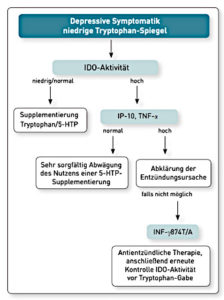 Wir sehen damit wieder psychische Zusammenhänge zum Tryptophanmangel. Auch in diesem Fall kann der Mangel an Tryptophan ernährungsbedingt und im Zusammenhang mit einem leaky Gut, dem löchrigen Darm und grundsätzlich einer Fehlbesiedlung im Darm stehen. Es gibt eine ganze Reihe von Zusammenhängen zwischen Darmbesiedlung, Psyche, Produktion von Neurotransmittern, Autoimmunerkrankungen und stillen Entzündungen. Im Falle einer erhöhten IDO-Aktivität kann eine Zufuhr von Tryptophan kontraindiziert sein, da damit nur der Stoffwechsel der Kynurine weiter angeregt wird und damit das Tryptophan nicht zu Serotonin verstoffwechselt werden kann. In diesem Fall ist zunächst nach den Ursachen der Entzündungen zu suchen und diese abstellen.