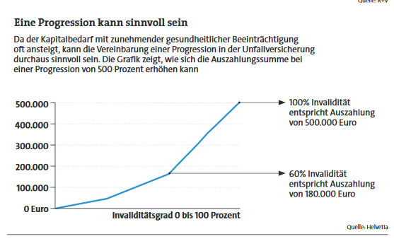 Für solche Fälle gibt es die Progression. Sie sichert zu, dass die Leistung mit zunehmendem Invaliditätsgrad steigt. Werksnies: „Für die Grundinvaliditätssumme wird in der Regel ein Wert zwischen 100.000 Euro und 150.000 Euro und eine Progression von 350 oder 500 Prozent gewählt. Die Gesamtleistung bei Vollinvalidität sollte rund 500.000 Euro betragen.“ Janitos und Interrisk etwa bieten aber auch Progressionsmodelle bis 1.000 Prozent an.