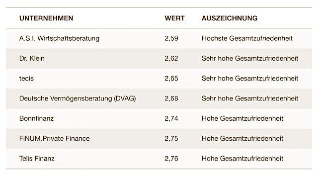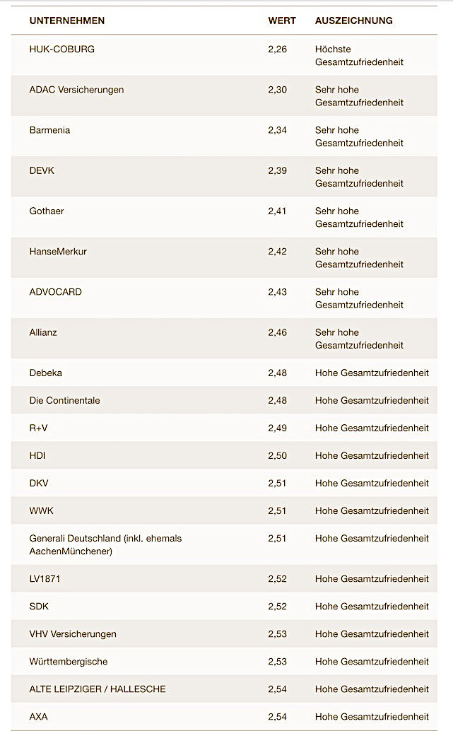 Die Bewertung „hohe Gesamtzufriedenheit“ erhielten alle Unternehmen, die unter ihresgleichen besser als der Gesamtmittelwert abschnitten. Unternehmen, die nochmals über dem Mittelwert dieser überdurchschnittlichen Anbieter liegen, schafften das Prädikat „sehr hohe Gesamtzufriedenheit“. Die „höchste Gesamtzufriedenheit“ erhielten die Unternehmen, die in ihrer Branche die beste Beurteilung erreichten.