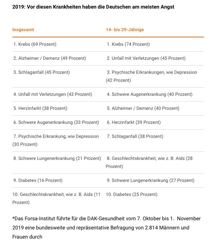 Das ist ein Ergebnis einer repräsentativen Studie der DAK-Gesundheit. Junge Menschen fürchten sich danach auch häufiger vor anderen Krankheiten als andere Altersgruppen – beispielsweise vor Diabetes oder schweren Augenerkrankungen.