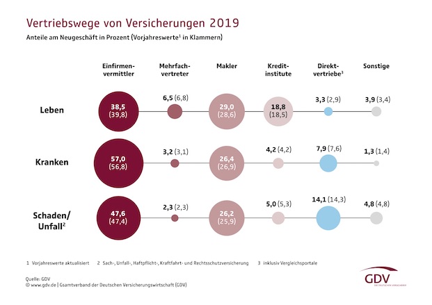 Die Tatsache, dass der größte Anteil des Versicherungsneugeschäfts unverändert auf Kanäle mit persönlichem Kundenkontakt entfällt, deutet der Verband als klares Zeichen, „wie wichtig die Beratung von hochqualifizierten Vermittlern für die Verbreitung von Risikoschutz und Altersvorsorge in der Bevölkerung ist“. Zugleich werde deutlich, dass es den Vermittlern gut gelinge, „sich auf die Erwartungen der Kunden an Service und Kommunikation einzustellen“, heißt es weiter.