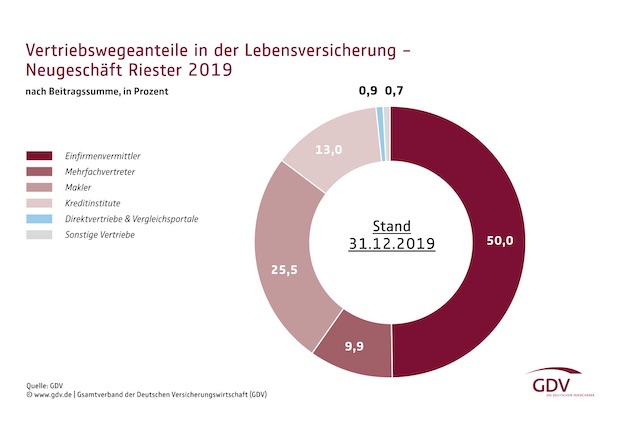 Vor allem im Neugeschäft mit Riester-Verträgen genießen Einfirmenvermittler mit einem Marktanteil von 50 Prozent eine starke Stellung (siehe Grafik).