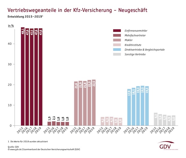 In der Kraftfahrzeugversicherung behält wiederum der Direktvertrieb seine signifikante Rolle. Viele Kunden schließen Kfz-Versicherungen online direkt bei einem Versicherer oder über ein Vergleichsportal ab. Knapp ein Fünftel des Neugeschäftsvolumens in der Kfz-Versicherung kommt so zustande. Allerdings sinkt der Anteil mit 19,3 Prozent erstmals leicht und fällt auf den Stand von 2017 zurück.