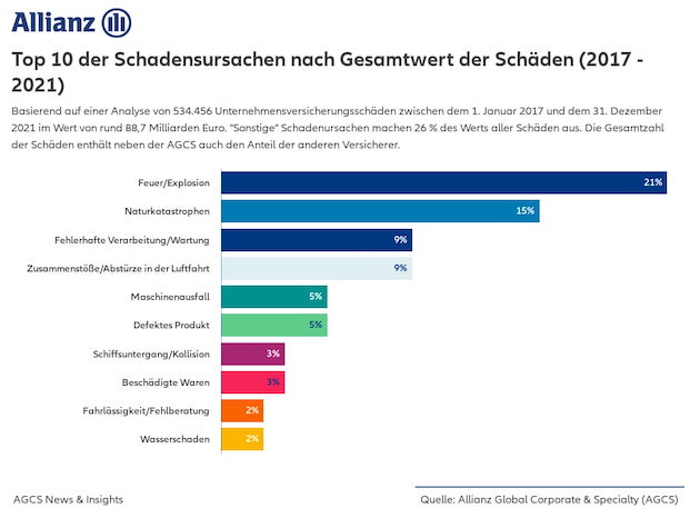 Feuer und Explosionen, Naturkatastrophen sowie eine fehlerhafte Verarbeitung und Wartung haben in den vergangenen fünf Jahren zu den teuersten Versicherungsschäden für Unternehmen weltweit geführt. Zu diesem Ergebnis kommt der Industrieversicherer der Allianz, AGCS, in seiner aktuellen Studie „Global Claims Review 2022“, die sich nicht nur auf Schäden bei der AGCS bezieht (Download hier).