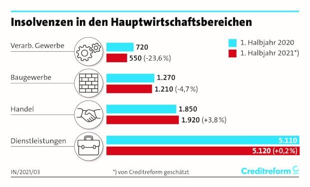 Beim Blick auf die Branchen zeigt die Auswertung, dass das Insolvenzaufkommen gerade in den Bereichen hoch war, die besonders hart vom Lockdown betroffen waren. Der Handel verzeichnete danach 1.920 Insolvenzen – ein Plus von 3,8 Prozent gegenüber dem Vorjahreszeitraum. Im Dienstleistungsgewerbe gab es 5.120 Insolvenzen. Auch das ist ein leichter Anstieg (0,2 Prozent).