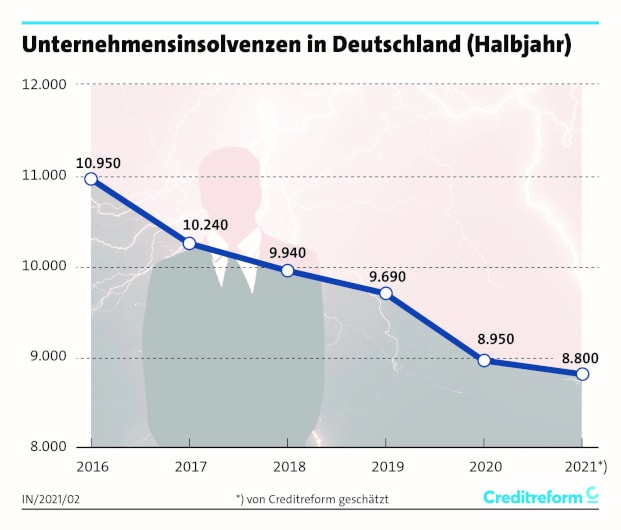Auch im 1. Halbjahr 2021 bleibt das Insolvenzgeschehen in Deutschland weiter rückläufig. Insgesamt gingen in diesem Zeitraum 8.800 Unternehmen pleite. Gegenüber dem Vorjahreszeitraum ist das ein Rückgang um 1,7 Prozent. Das meldet die Wirtschaftsauskunftei Creditreform (siehe Grafik).