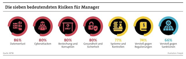 Einen weiteren Risikokomplex für Führungskräfte sieht die Umfrage von WTW in Verstößen zu Governance- und Compliance-Fragen: 80 Prozent der befragten Manager befürchten Bestechungs- oder Korruptionsvorwürfe und etwa 77 Prozent Konsequenzen aus einer fehlerhaften Unternehmensführung.