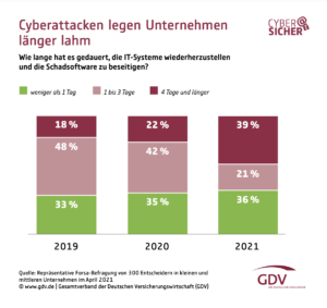Einer aktuellen Studie im Auftrag des Gesamtverbands der Deutschen Versicherungswirtschaft (GDV) zufolge werden die Folgen von Cyber-Attacken für mittelständische Unternehmen gravierender. 39 Prozent der Unternehmen gaben an, vier oder mehr Tage für die Wiederherstellung ihrer IT-Systeme gebraucht zu haben. In den Vorjahren hatte dieser Wert noch bei 20 Prozent gelegen.