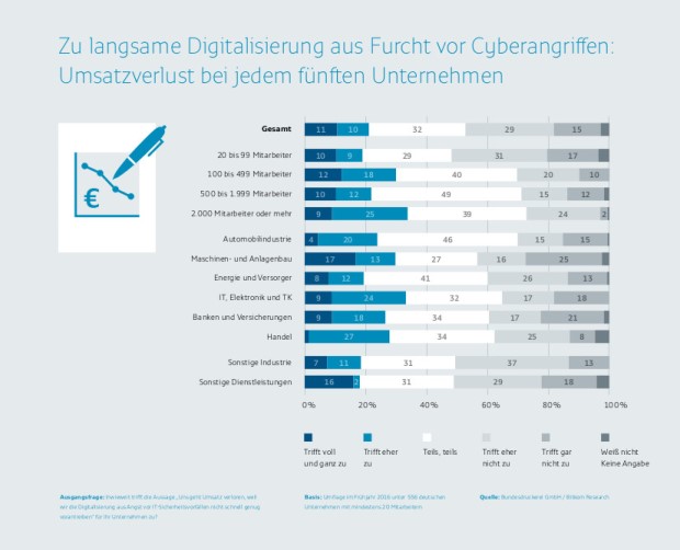 Danach verzichten überdurchschnittlich viele Maschinen- und Anlagenbauer verzichten auf Umsatz, weil sie aus Angst vor Cyberattacken ihre Prozesse, Produkte und Services langsamer digitalisieren: Auf jedes sechste (17 Prozent) Unternehmen dieser Branche trifft diese Aussage „voll und ganz zu“, auf weitere 13 Prozent trifft sie „eher zu“, auf weitere 27 Prozent teilweise.