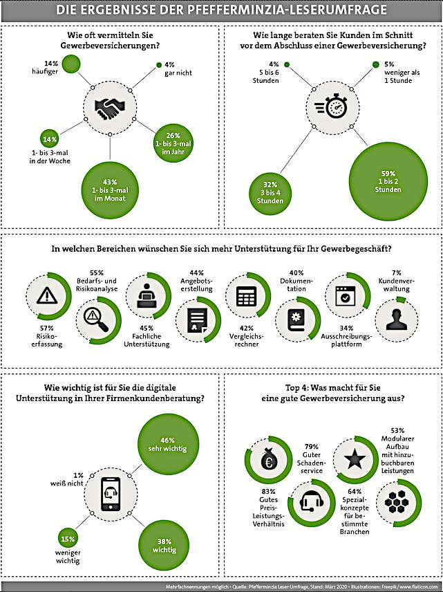 Tatsächlich verdeutlicht diese Situation, wie wichtig ein passender Versicherungsschutz für Gewerbetreibende ist. Pfefferminzia hat im März Makler dazu befragt, was ihnen beim Thema Gewerbeversicherung wichtig ist. Die Umfrage lief allerdings, bevor das Corona-Virus in seiner Vehemenz um sich griff. Die Ergebnisse beziehen daher die Pandemie und ihre Folgen nicht mit ein.