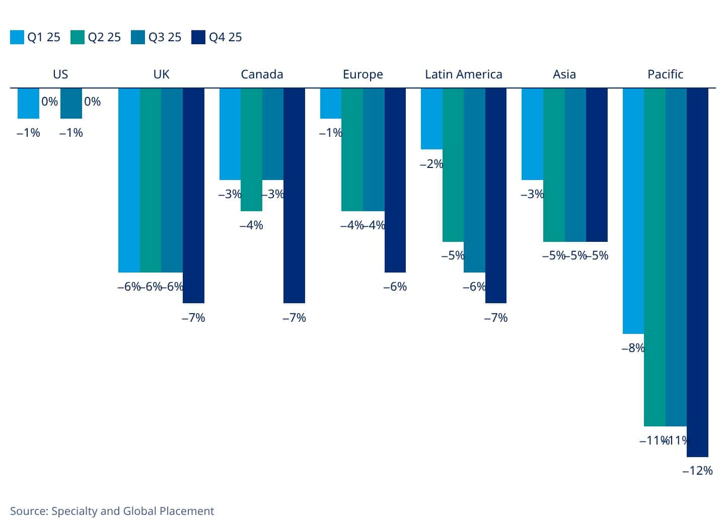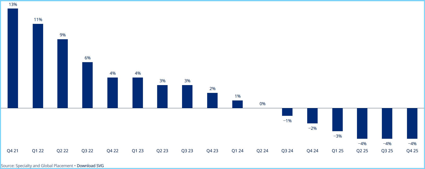 Denn die Tochter des Versicherungsmaklers Marsh beobachtet, dass inzwischen im sechsten Quartal in Folge die Prämien gesunken sind. Im vierten Quartal 2025 ging es um 4 Prozent hinab. Im zweiten und dritten Quartal lag der Schwund prozentual genau so hoch (siehe Grafik).