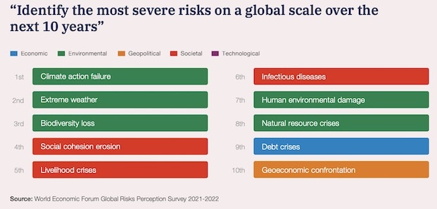 Rund 1.000 Experten aus Wirtschaft, Politik und Wissenschaft weltweit wurden auch diesmal wieder darum gebeten, wie die aus ihrer Sicht größten globalen Bedrohungen lauten. Die Ergebnisse sind nun in der Studie „Global Risks Report 2022“ des World Economic Forum, dem 17. aus dieser Reihe, zu besichtigen (Download hier).
