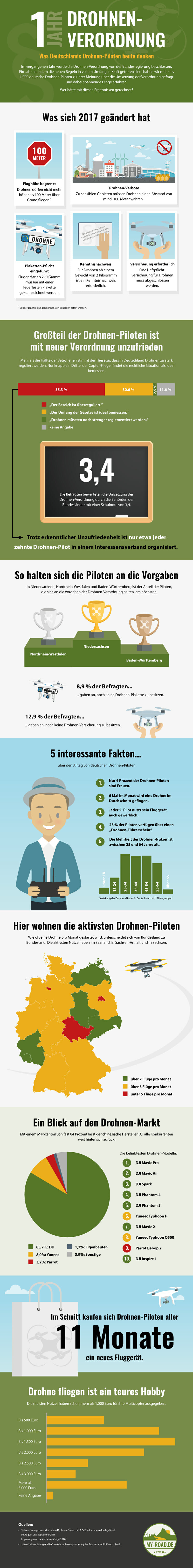 Eine aktuelle Umfrage hat untersucht, wie zufrieden die deutschen Drohnen-Nutzer mit der sogenannten Drohnen-Verordnung sind, die seit 1. Oktober 2017 gilt. Die Grafik wurde uns freundlicherweise vom Reise- und Drohnenblog My-Road.de zur Verfügung gestellt. © my-road.de