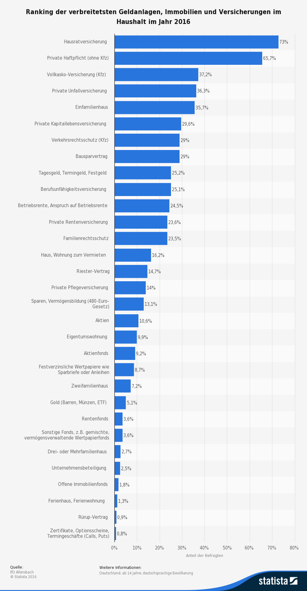 Hausrat liegt vorn, und Tagesgeldkonten schlagen Berufsunfähigkeitsversicherungen: Das zeigt die Umfrage des IfD Allensbach zur Verbreitung von Versicherungen und Kapitalanlagen in Deutschland. © Statista