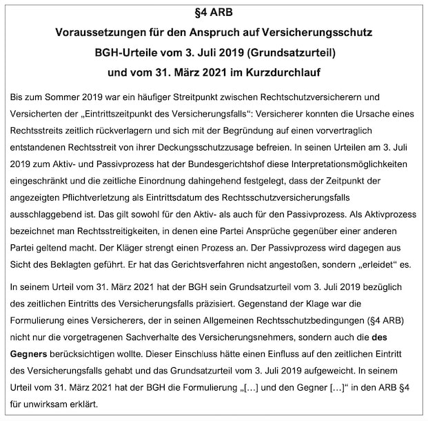 Jöhnke: Deshalb halte ich das BGH-Urteil für ausgesprochen verbraucherfreundlich. Ich rate meinen Mandantinnen und Mandanten, die wegen eines möglichen zukünftigen Rechtsstreits in meine Kanzlei kommen, umgehend eine Rechtsschutzversicherung abzuschließen, falls sie noch keine haben. Denn dann können wir, nach der neuen gesetzlichen Regelung und gemäß ARB Paragraf 4, die Deckungszusage beim Rechtsschutzversicherer einklagen.