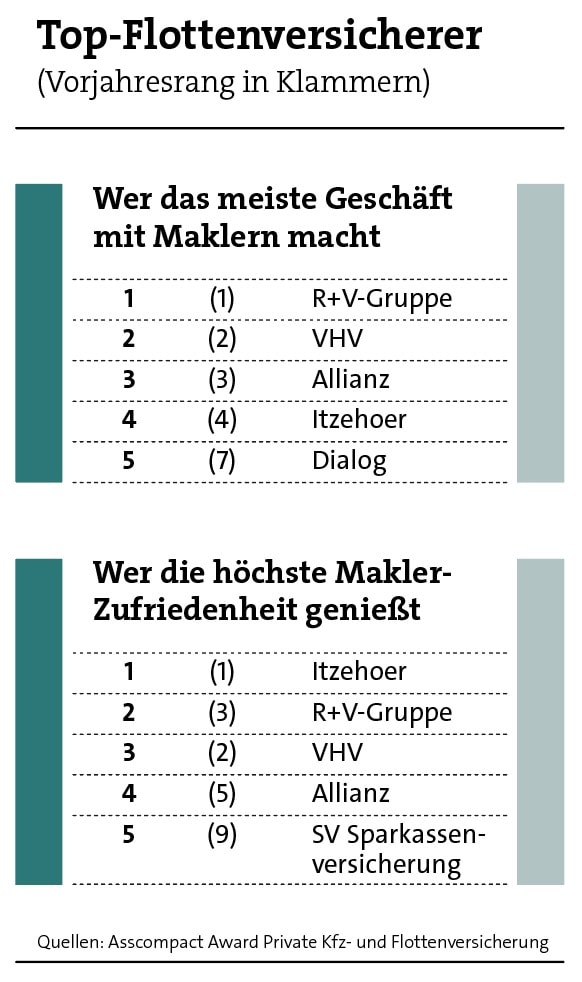 Die Wiesbadener erzielen unter Maklern traditionell die höchsten Geschäftsanteile im Flottengeschäft und sind damit in diesem Segment der umsatzstärkste Versicherer im freien Vermittlungsgeschäft (siehe Tabelle). „Eine große Herausforderung ist der Preisanstieg und die damit verbundene Entwicklung der Schadendurchschnitte. Dies wird sich auf die bevorstehenden Anpassungen der Beiträge auswirken“, prognostiziert Carsten Panzer, Underwriter Kfz-Betrieb bei der R+V Versicherung.
