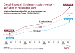„Der Gesamtstreitwert aller über die Rechtsschutzversicherer abgewickelten Diesel-Rechtsschutzfälle ist inzwischen auf über 9 Milliarden Euro gestiegen“, so Asmussen weiter. Aktuellen GDV-Zahlen zufolge sind allein seit der letzten Zählung im Oktober 2020 nochmals rund 60.000 Rechtsschutzfälle und ein Mehraufwand von mehr als 250 Millionen Euro hinzugekommen.
