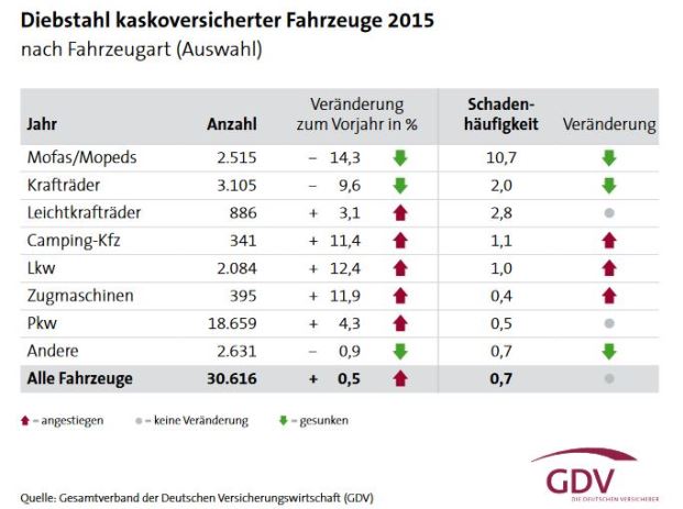 Diebe haben laut GDV-Statistik im vergangenen Jahr 18.659 kaskoversicherte Autos gestohlen, das sind rund 4 Prozent mehr als 2014. Da zudem die durchschnittliche Entschädigung für jeden Diebstahl mit 15.611 Euro eine neue Rekordhöhe erreicht hat, ergibt sich nach Verbandsrechnung ein Gesamtschaden von 291 Millionen Euro.