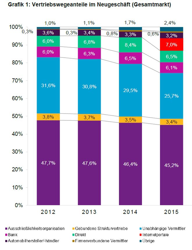 Wie die Daten für das Jahr 2015 zeigten, werde mit einem Anteil von 7,0 Prozent „noch eher wenig Neugeschäft über Portale abgewickelt“, so die Einschätzung der Berater. Zwar nehme der Vertriebsanteil der Ausschließlichkeitsorganisation (AO) „in kleinen Schritten weiter ab“, allerdings bleibe die AO mit rund 45 Prozent Marktanteil (2014: 46,4 Prozent) der stärkste Vertriebskanal. Deutlich abgeschlagen folgen die unabhängigen Vermittlern mit 25,7 Prozent (29,5 Prozent), dahinter besagte Internetportalen (7,0 Prozent) sowie der Direktvertrieb mit 6,5 Prozent (siehe Grafik).