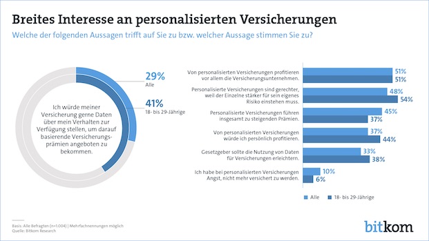 Jeder zweite Deutsche findet zudem, dass solche personalisierten Versicherungen gerechter sind, weil der Einzelne stärker für sein eigenes Risiko einstehen muss. Unter den Jüngeren bis 29 Jahre stimmen sogar 54 Prozent dieser Aussage zu. Jeder Dritte (37 Prozent) geht davon aus, persönlich von solchen Policen zu profitieren, unter den Jüngeren sind es 44 Prozent. Jeder dritte Befragte (33 Prozent; unter den 18- bis 29-Jährigen: 38 Prozent) wünscht sich daher, dass die Politik die Nutzung von Daten für Versicherungen erleichtert.