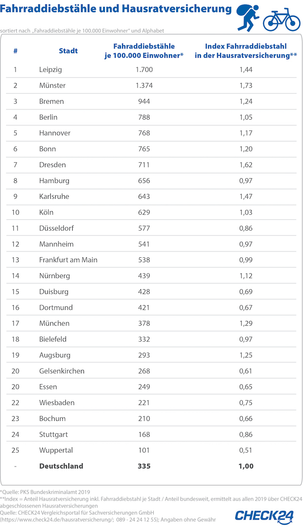 Laut aktuellen Zahlen der Polizeilichen Kriminalstatistik (PKS) werden in Leipzig und Münster im Vergleich der 25 größten deutschen Städte im Verhältnis zur Einwohnerzahl die meisten Fahrräder gestohlen. In Leipzig kamen im vergangenen Jahr 1.700 geklaute Räder auf 100.000 Einwohner – fünfmal so viele wie im Bundesdurchschnitt, der bei 335 liegt. In Münster wurden 2019 insgesamt 1.374 Fahrraddiebstähle erfasst.