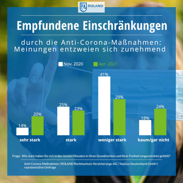 „Wie sehr fühlen Sie sich durch die Maßnahmen zur Eindämmung der Corona-Pandemie in Ihren Grund- und Freiheitsrechten eingeschränkt?“ Das hat der Kölner Rechtsschutzversicherer Roland die Bürger im November 2020 und jetzt wieder im April gefragt. Ein Vergleich der beiden repräsentativen Umfragen zeigt: Das Stimmungsbild in der Bevölkerung hat sich in den vergangenen Monaten gravierend geändert. Kurz gesagt: An der Corona-Politik scheiden sich immer mehr die Geister.