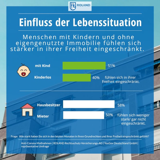 Die Umfrage-Ergebnisse bestätigen darüber hinaus, worauf Experten in den vergangenen Monaten immer wieder hingewiesen haben: Die Pandemie belastet ganz besonders Familien. So sagen aktuell 51 Prozent der Befragten mit mindestens einem Kind, aber nur 40 Prozent der Kinderlosen, dass sie sich in ihrer Freiheit eingeschränkt fühlen. Ebenfalls wenig überraschend: Wer eine eigene Immobilie – womöglich mit Terrasse oder Garten – bewohnt, sieht die Situation etwas gelassener.