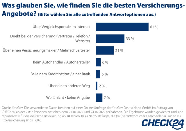 Über Vergleichsportale im Internet glauben 61 Prozent der Befragten, die besten Angebote zu finden. 33 Prozent sprechen direkt einen Versicherer an und 21 Prozent vertrauen ihrem Versicherungsmakler. Auch beim tatsächlichen Abschluss liegt der Online-Abschluss unter den Befragten mit 58 Prozent vorne, 40 würden direkt beim Versicherer abschließen und 24 Prozent beim Makler.